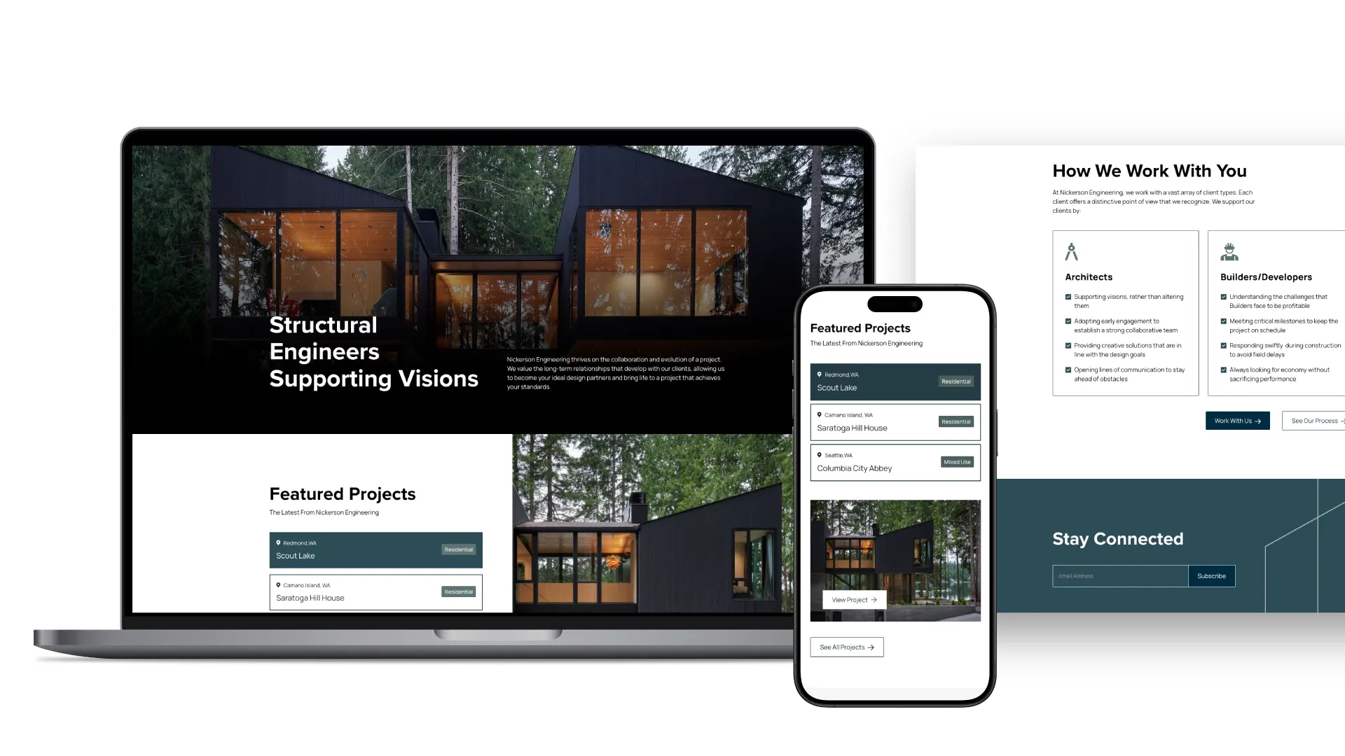 Nickerson Engineering’s updated website and refreshed brand aim to tell their story as a dynamic structural engineering firm. The new site showcases their expertise across diverse projects, including mixed-use, commercial, and residential developments, while also presenting a modern visual identity that mirrors the quality and creativity of their work. This update not only highlights Nickerson’s professional achievements but also strengthens their online presence as a trusted partner in structural engineering.